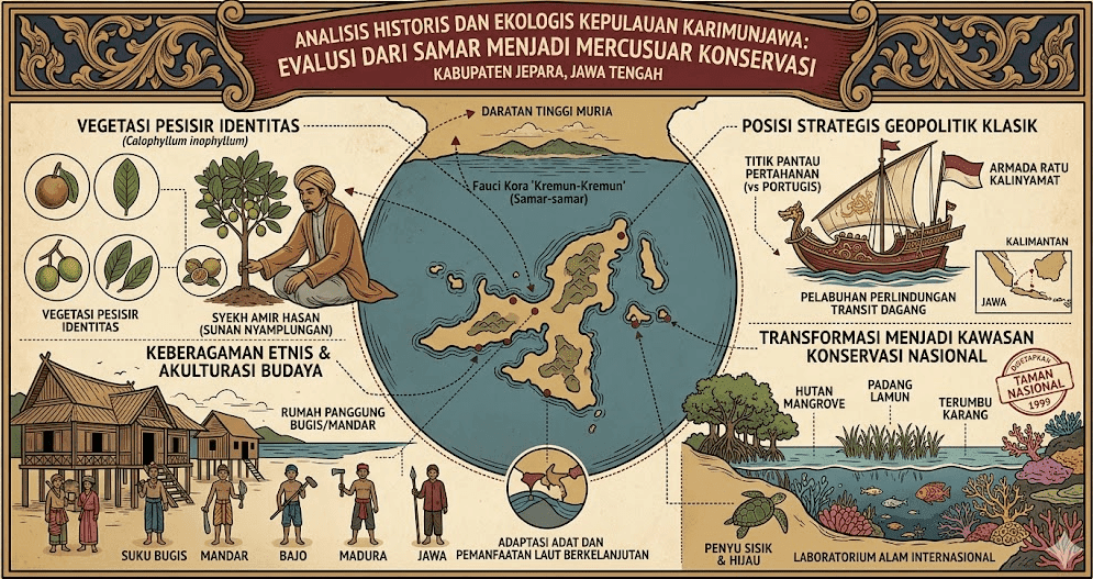 JEPARA | MATAMERDEKA.COM – Kepulauan Karimunjawa, yang secara administratif merupakan bagian dari Kabupaten Jepara, bukan sekadar gugusan pulau tropis. Secara historis, wilayah ini mencerminkan perpaduan antara legenda penyebaran Islam, strategi maritim zaman kerajaan, hingga evolusi kebijakan konservasi modern di Indonesia.