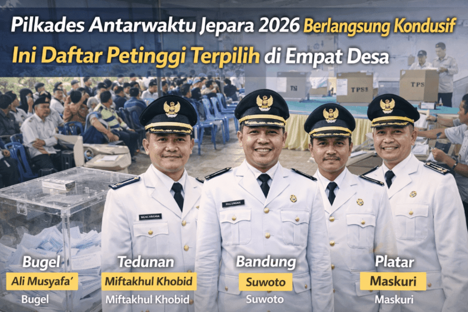 JEPARA | MATAMERDEKA.COM – Pelaksanaan Pemilihan Petinggi atau Kepala Desa (Pilkades) Antarwaktu di Kabupaten Jepara yang digelar serentak pada Senin (30/3/2026) berlangsung sukses. Empat desa dari tiga kecamatan berbeda kini telah memiliki calon pemimpin baru yang terpilih melalui proses yang aman dan tanpa gesekan.