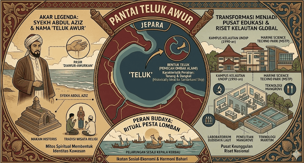 - Asal-Usul Nama: Konon, nama “Teluk Awur” berasal dari peristiwa saat Syekh Abdul Aziz dikejar oleh musuh-musuhnya. Beliau kemudian menaburkan pasir (diawur-awurkan dalam bahasa Jawa) yang secara ajaib berubah menjadi barisan prajurit atau kabut tebal untuk melindungi diri.